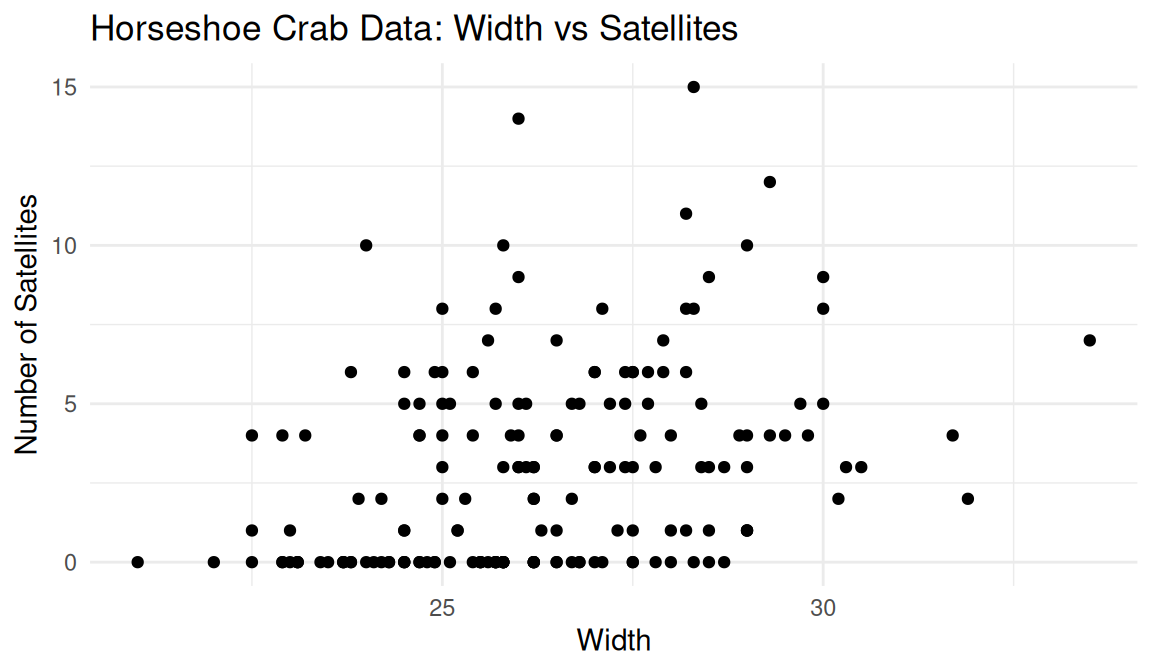 ggplot(crabs, aes(x = Width, y = Satellites)) +geom_point() +labs(title ="Horseshoe Crab Data: Width vs Satellites",x ="Width",y ="Number of Satellites" ) +theme_minimal()